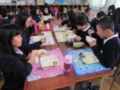 今日の給食では、さといも、ニンジン、油あげなどを煮て、とろみをつけています。