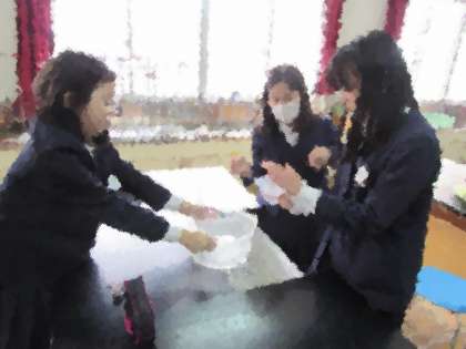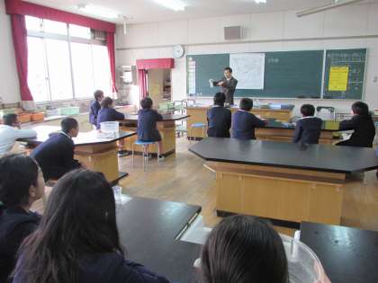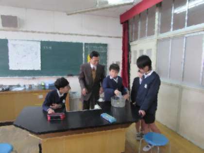 理科の授業では、大気圧を感じる実験を行いました。水をいっぱい入れたコップにふたをして、ひっくり返しても水がこぼれないことや、水を入れて加熱したボトルにふたをし、中の水蒸気が冷えると気圧が下がり、音を立ててボトルがへこんでいく様子などを体感することができました。
