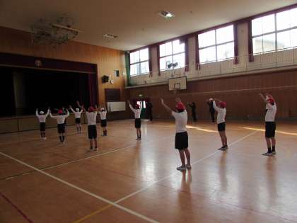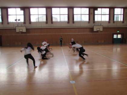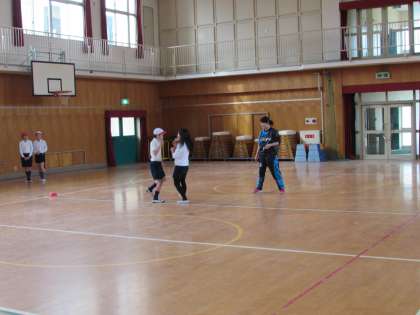 体育の授業は、体育館で行いました。ねこチームとねずみチームに分かれて、ダッシュで競争したり、Sけんをしたりして、楽しみました。