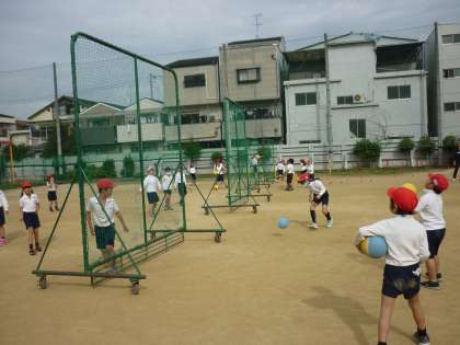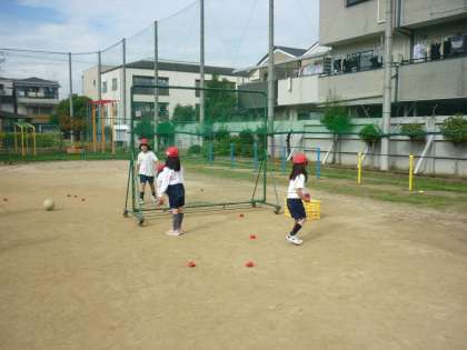 フェンスを使って、ボール投げの練習をしました。山なりのボールを投げることができる子が増えてきました。