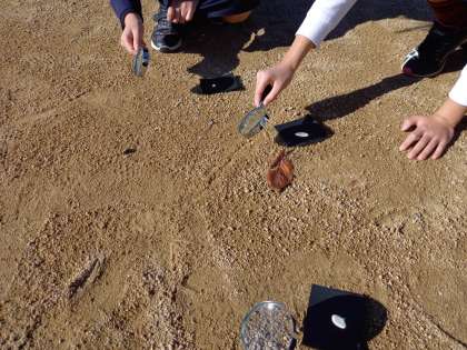 虫めがねで日光を集める実験をしました。日光を集めたところを小さくするほど、明るく、熱くなることが分かりました。