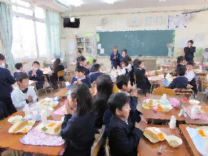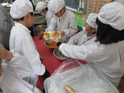 3年生が、協力して配膳し(画像上)、声を合わせて「いただきます!」(画像中)
