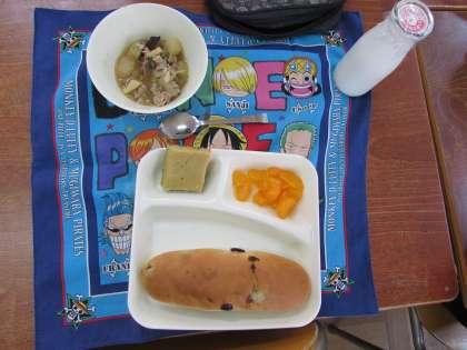 本日の給食の献立をご紹介します。本日の給食は、レーズンパン、豚肉と大根の煮物、チヂミ、みかんの缶詰、牛乳でした。