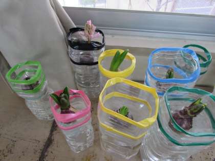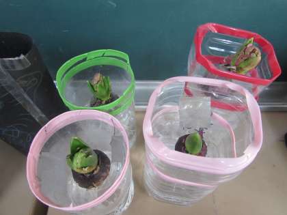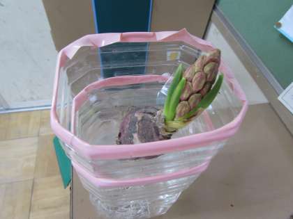 2年生は、教室で、ヒヤシンスの水栽培を行っています。根が伸び、葉も伸びて、つぼみが見られるものもあります。
