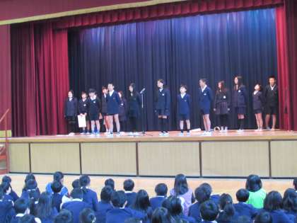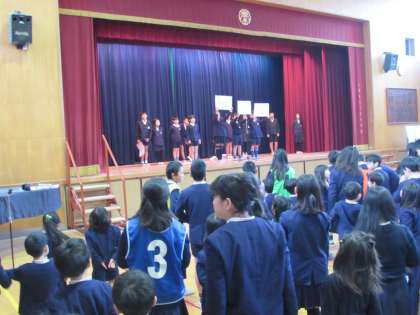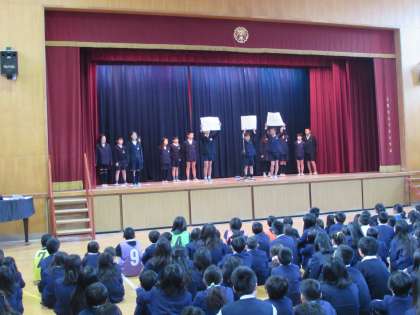木曜日の朝、児童集会の様子をご紹介します。本日の児童集会では、放送委員会の発表を行いました。クイズも交えながら、放送委員会の日常の活動についての紹介を行っていきました。放送委員会の活動について、しっかりと知らせることができたと思います。
