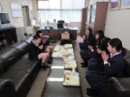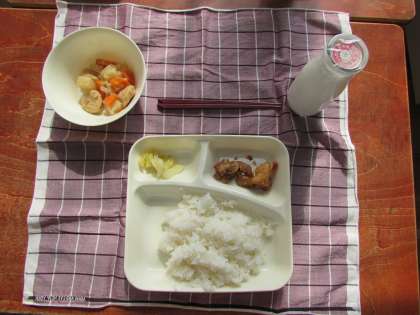 本日の給食の献立をご紹介します。本日の給食は、ご飯、鶏肉の竜田揚げ、ジャガイモと野菜の煮物、白菜の酢の物、牛乳でした。