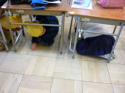 教室で地震が起きたら、机の下に入り、自分の身を守る行動をしました。次に、運動場に避難し、その後津波が来ることを想定し、3階以上に避難する練習をしました。