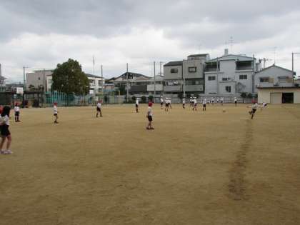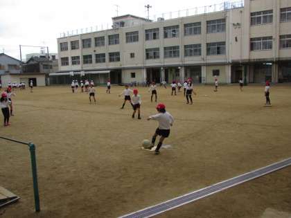 3年生の体育の学習です。1組は、運動場でキックベースをしています(画像上・中)。