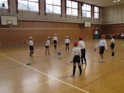 2組は、体育館で「プレルボール」を行っています(画像下)。