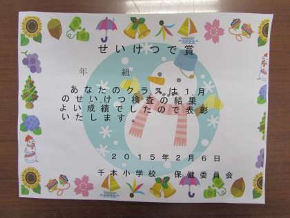 保健委員会では、隔週金曜日の朝、各教室へ行き、清潔検査を行っています。清潔検査では、ハンカチ・ティッシュを持っているか、きちんと爪を切っているかを点検します。その結果、成績のよいクラスは、「せいけつで賞」をもらえます。今回は、3クラスが、「せいけつで賞」をもらうことができました。次回には、全クラスがもらえるといいな、と思います。ご家庭での声かけを、どうぞよろしくお願いいたします。