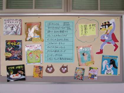 職員室の前の廊下にある掲示板で、学校図書館に新しく入った本の紹介をしています。千本小学校の子どもたちは、読書が大好きです。新しい本で、また、本を読む意欲がわくといいですね。