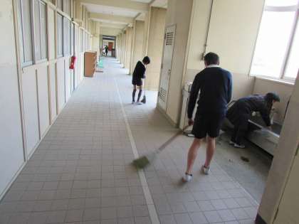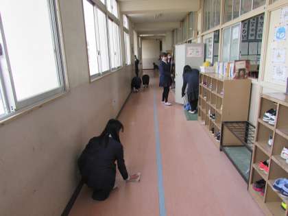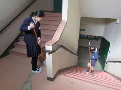 給食を食べ終わったら、清掃活動が始まります。各学年の子どもたちが、自分たちの分担場所を一生懸命に清掃しています。自分の分担場所が終わったら、まだ清掃が終わっていない場所に行って、協力して清掃に取り組んでいます。