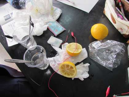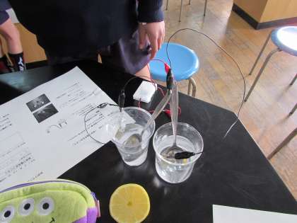 木曜日の6時間目、クラブ活動の様子をご紹介します。本日ご紹介するのは、科学クラブです。本日の科学クラブでは、「通電」の実験をしました。食塩水やレモンを使って、回路が完成するのか、実験しています。