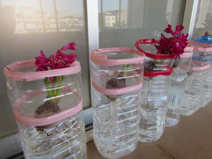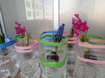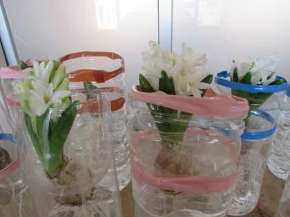 2年生が水栽培で育てているヒヤシンスが花を咲かせ始めました。さまざまな色の花が、雰囲気を明るくしてくれています。