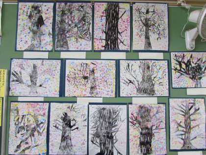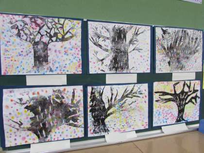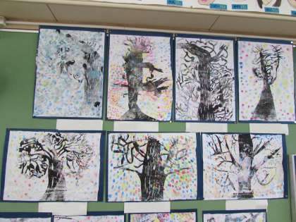 3年生が紙版画に取り組みました。紙で大きな木を、絵の具のぼかしも使って、「もちもちの木」を表しました。大きく、のびのびと表現することができました。