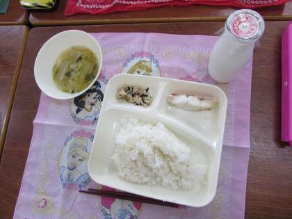 本日の給食の献立をご紹介します。本日の給食は、ご飯、あかうおのレモンじょうゆがけ、うすくず汁、高野豆腐の炒り煮、牛乳でした。子どもたちは、高野豆腐の炒り煮をご飯にかけ、おいしくいただきました。