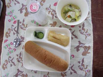 本日の給食の献立をご紹介します。本日の給食は、ライ麦パン、いか天ぷら、スープ煮、あっさりきゅうり、牛乳でした。