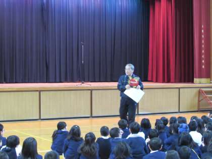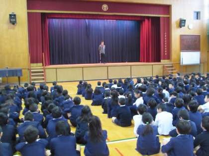 月曜日の朝、全校朝会の様子をご紹介します。初めに、学校長から、子どもたちへの話です。今日は、学校のものを大切に扱おうという話、千本小学校の子どもたちの虫歯が少なくて表彰をされたという話、そして楽しい本の紹介がありました。今日紹介されたのは「トマトのひみつ」という本です。トマトに、いったいどんな秘密があるというのでしょう?