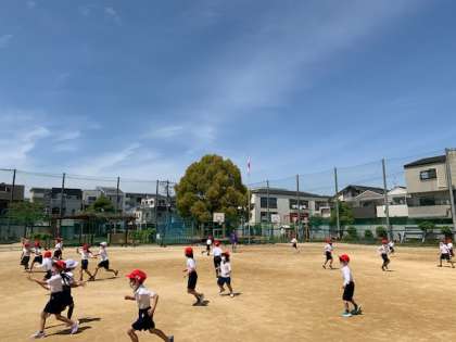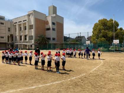 今、1年生の体育では、並び方の練習をしています。先生の号令で、「ピシッと」と指先までまっすぐに、整列ができていました。すばらしいです。体育の後半は、学年全体で、増え鬼をしました。