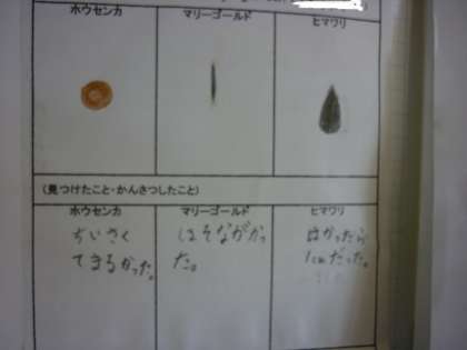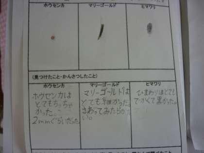 ホウセンカ、マリーゴールド、ヒマワリの種の観察をしました。それぞれの種の色、形、大きさなど気がついたことを観察カードにまとめました。
