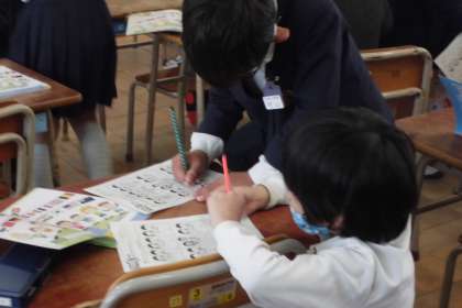 「HELLO! How are you?」「I’m fine.」などの答え方を、ジェスチャーを入れて教えていただきました。そのあとBINGOカードを持って、先生や友達と会話をし、どう答えたか記入していきました。みんな恥ずかしがらずに笑顔で答えていました。