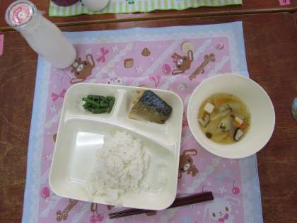 本日の給食の献立をご紹介します。本日の給食は、ご飯、さばのしょうがじょうゆかけ、すまし汁、さんど豆の胡麻和え、牛乳でした。