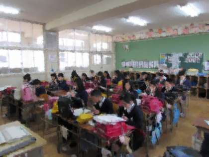 6年生の終わりの会の様子です。日直の合図に合わせて、皆でリコーダーを吹いています。全員の音が一つに重なった時、皆の心も一つに重なったように感じます。