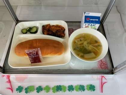 本日の献立は、じゃがいものミートグラタン、スープ、きゅうりのバジル風味サラダです。