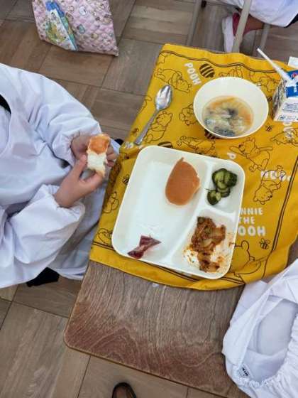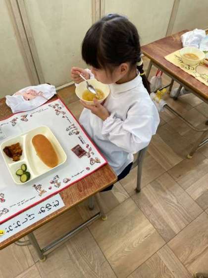 食事のマナーを守り、パンをちぎって食べています。お椀を持って食べています。