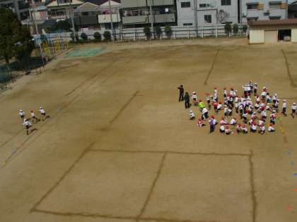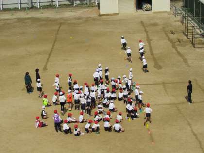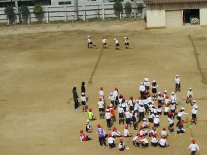 3年生が、運動場で体育を行っています。今日はリレーの学習です。一生懸命に走る子ども、大きな声援を送る子ども。運動場に、3年生の子どもたちの声が響き渡りました。