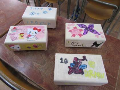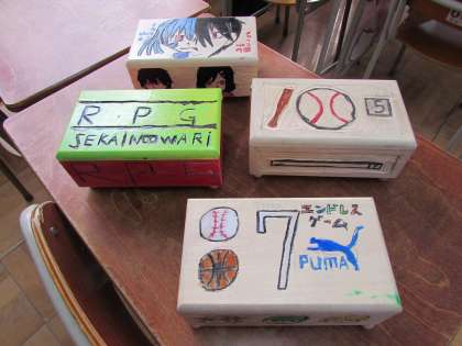6年生が取り組んでいる卒業記念品のオルゴールです。彫刻刀で掘り、絵の具で彩色しました。ニスを塗ると、ぴかぴかに光って、とっても素敵なオルゴールができました。