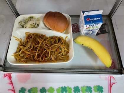 本日の献立は、カレースパゲッティ、キャベツのひじきドレッシング、バナナです。