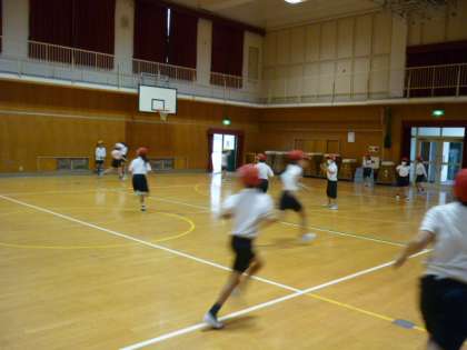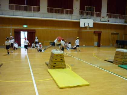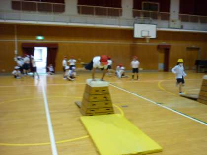 講堂でおにごっこやとびばこをしました。「とべたー!やったぁ!」という声がきこえてきました。元気いっぱい活動しました。