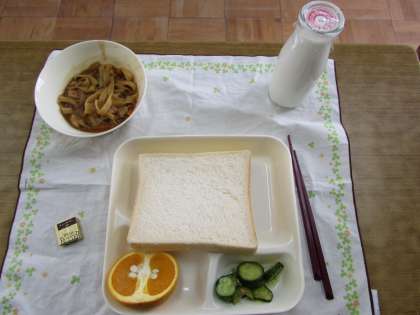 本日の給食の献立をご紹介します。本日の給食は、食パン、バター、みそきしめん、あっさりきゅうり、清見オレンジ、牛乳でした。