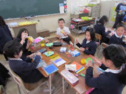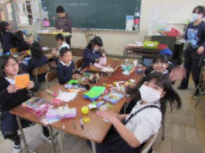 2年2組は、図画工作の学習で、家庭から持ち寄った箱に飾りをつけています。2年生の子どもたちが丁寧に飾りを作っています。