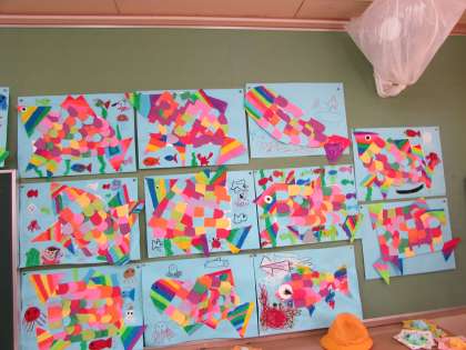 教室後ろの壁面には、「にじいろのさかな」が掲示してあります。その名の通り、とても色鮮やかで、見ていると楽しい気分になる魚たちです。