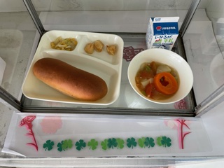 本日の献立は、いか天ぷら、フレッシュトマトのスープ煮、サワーソテーです。