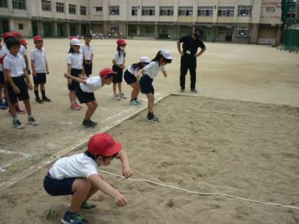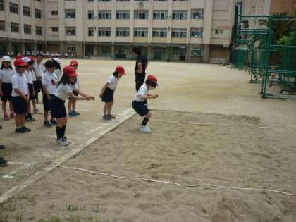 立ち幅跳びの練習をしました。両腕を振ってジャンプ!!
