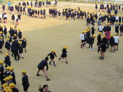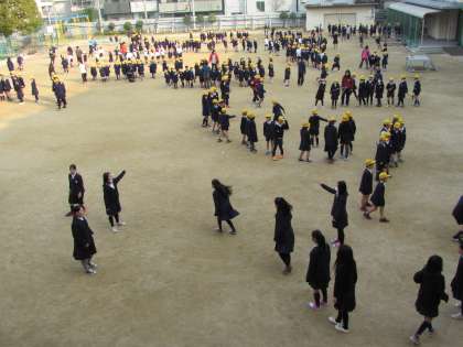 木曜日の朝、児童集会の様子をご紹介します。本日の児童集会は、体育委員会による「大縄遊び」でした。各クラスで1本ずつ縄を使って、跳んでいきました。高学年は8の字跳びにもチャレンジしました(画像上)。1年生は、体育委員会の子どもが縄を持ちました(画像中)。全校で、楽しい時間を過ごすことができました(画像下)。