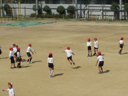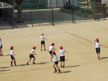 3年生が、運動場で体育の学習をしています。班ごとに、大縄に取り組んでいます。3年生の子どもたちは、回している縄の中に上手に入っていくことができていました。