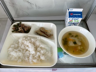 本日の献立は、イワシ天ぷら、五目汁、豚肉とさんどまめの炒め物です。