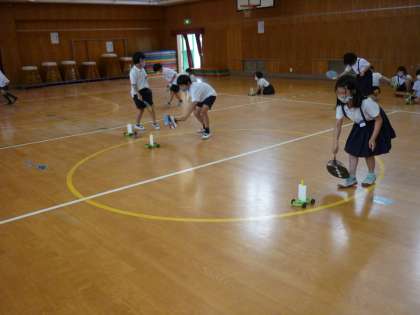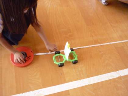 「風はものをうごかすはたらきがあるのかな?」というめあてをもって学習に取り組みました。強い風と弱い風では、車が走る距離がどのようになるのかを実験しました。