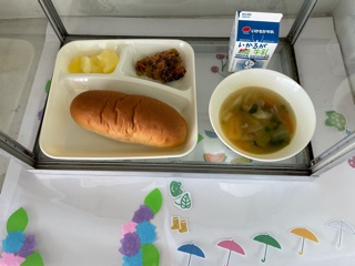 本日の献立は、カレードリア、豚肉とキャベツのスープ、りんごの缶詰です。
