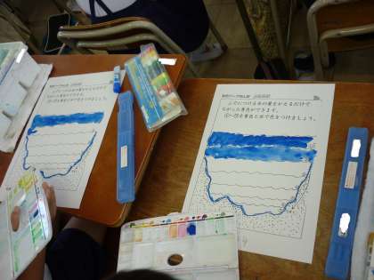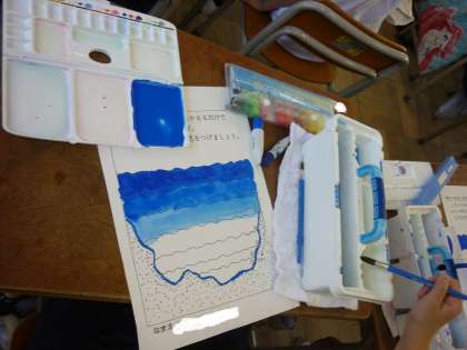 図工「ふでにつける水の量をかえるだけで違った青色を作ろう」