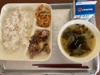 本日の献立は、豚肉の甘辛焼き、すまし汁、切り干し大根の炒め煮です。