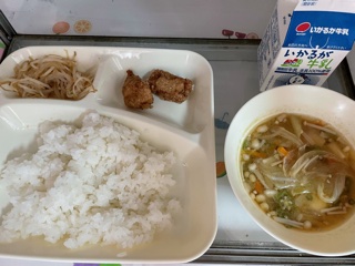 本日の献立は、豚肉の香味揚げ、味噌汁、もやしのおひたしです。