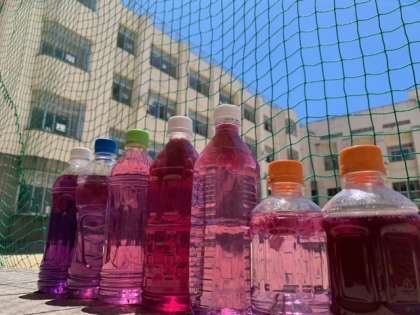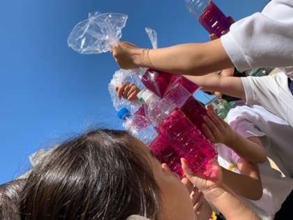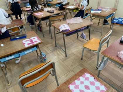 1年生の初めのころから育てていた朝顔の葉を凍らして、袋に詰めすりつぶしました。そこに水を少し入れると、おりぞめ専用の液が完成です。子どもたちはその液を折りたたんだ和紙に染み込ませ、色々な模様を作りました。初めての作業でしたが、上手に楽しく行っていました。自分で育てた朝顔は一人ひとり色に違いが出ていて、とても綺麗でした。一学期最後にとても良い作品ができ、子どもたち、学年団共に心から喜んでいます。