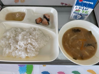 1学期最後の献立は、鮭のつけ焼き、味噌汁、冬瓜の煮物です。