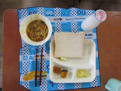 子どもたちは、食パンをちぎってスパゲティのスープにつけながら、「おいしい。」と、食べていました。