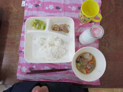 本日の給食の献立をご紹介します。本日の給食は、ご飯、焼き鳥、豚肉と野菜の煮物、キャベツのかつお梅風味、牛乳でした。